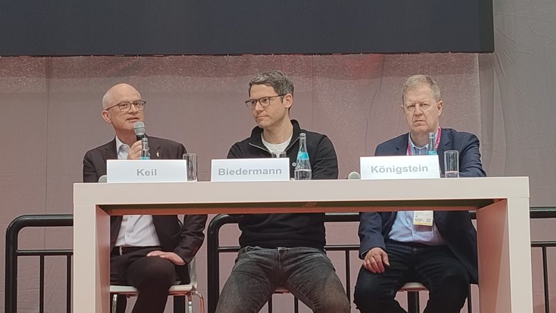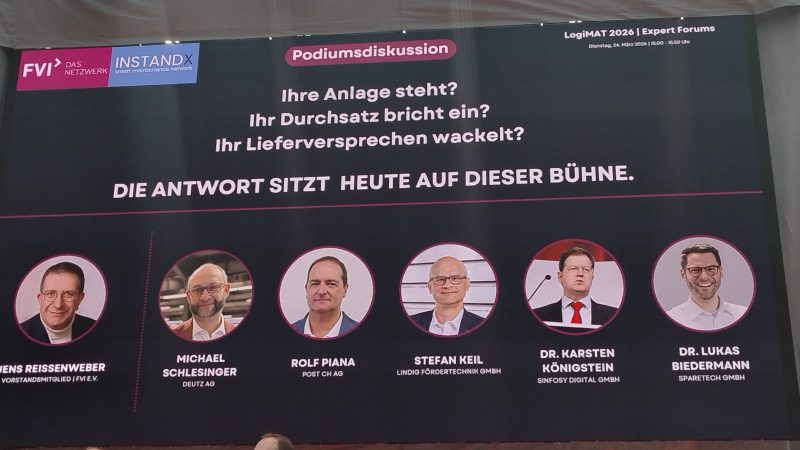 Am Dienstag, den 24. März fand in der LogiMAT Arena im Atrium, Eingang Ost eine Podiumsdiskussion zum Thema: „Über den Tellerrand gucken – was Intralogistik und modernes Anlagenmanagement verbindet“ statt. Unter der Moderation von Jens Reissenweber, Vorstandsmitglied des Forum Vision Instandhaltung (FVI) diskutierten Michael Schlesinger (Deutz AG), Rolf Piana (Post CH), Stefan Keil (Lindig Fördertechnik), Dr. Karsten Königstein (sinfosy) und Dr. Lukas Biedermann (sparetech) sowohl von Anwender- als auch von Anbieterseite, in welchen Einsatzbereichen sich Intralogistik und Smart Maintenance unterstützen und ergänzen können. Mit konkreten Fallbeispielen wurden die vielseitigen Möglichkeiten gezeigt und dem Besucher so einen Blick über den Tellerrand ermöglicht.